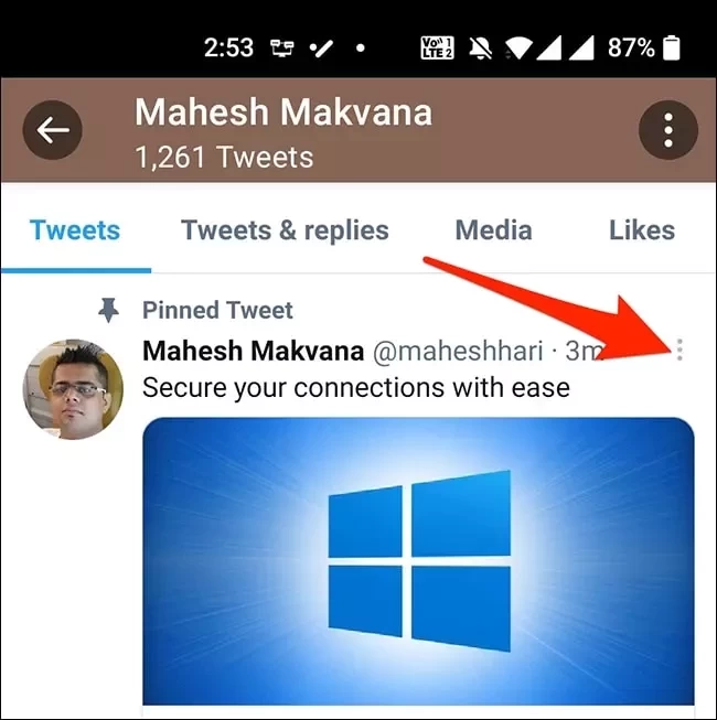 7、若要取消固定推文,在Twitter移动应用中,滚动至个人资料页面顶部。接着,在置顶推文的右上角,点击三点菜单。