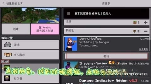 5、最后进入“附加件”设置,在其中找到资源包与行为包,把珍妮模组激活,之后就能开启游戏体验啦。