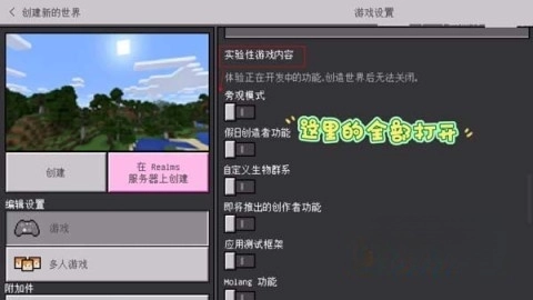 4、在页面上向下滑动,寻找到“实验性游戏内容”,把所有选项都开启。