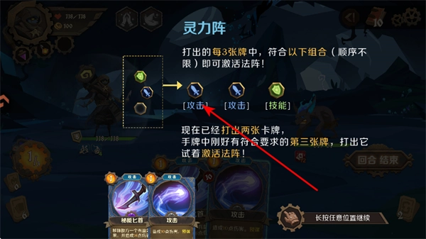 4、依据灵力阵的组合规则,打出满足条件的卡牌,从而激活法阵,获取增益效果,以此提升战斗能力。
