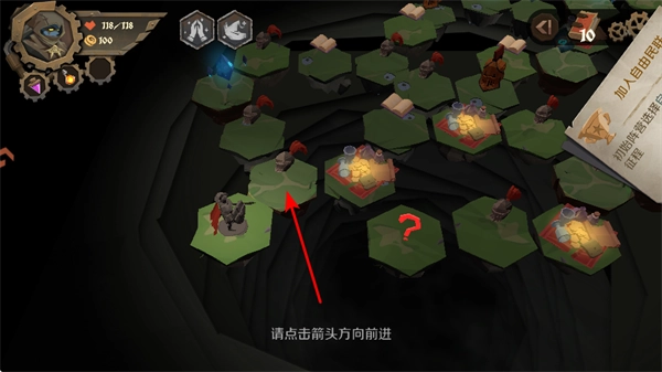2. 通过移动进行探索,在关卡地图内点击箭头所指方向即可前进,对六边形地块展开探索,探索过程中可能触发事件并遭遇敌人。