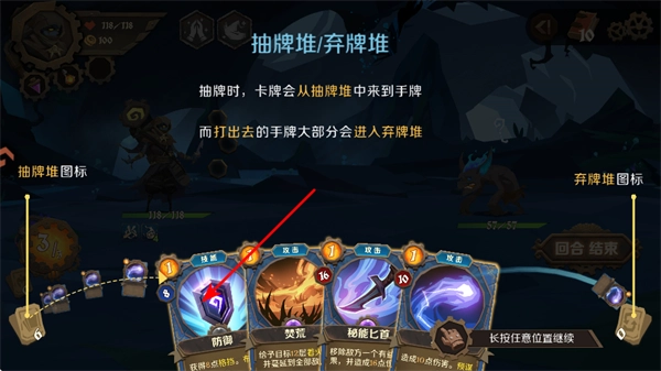 3、卡牌操作方面,要熟悉抽牌堆与弃牌堆的运作机制。通过从抽牌堆抽牌来补充手牌数量,随后可打出手中的卡牌,以此展开攻击或者防御行动。