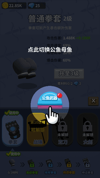 7、在武器界面,能够对公鱼和母鱼的装备进行切换操作,还能为它们的装备进行升级。