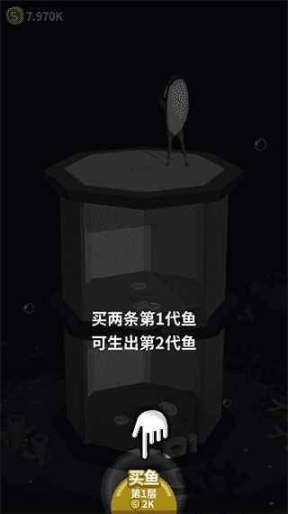 1、游戏开始时要持续购买鱼,购买两条第一代的鱼,便能生出第二代鱼。