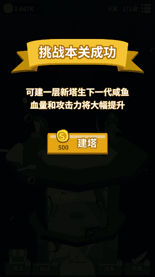 4、成功闯关后,搭建一层新塔,孵化下一代咸鱼,其血量与攻击力会得到显著提升。