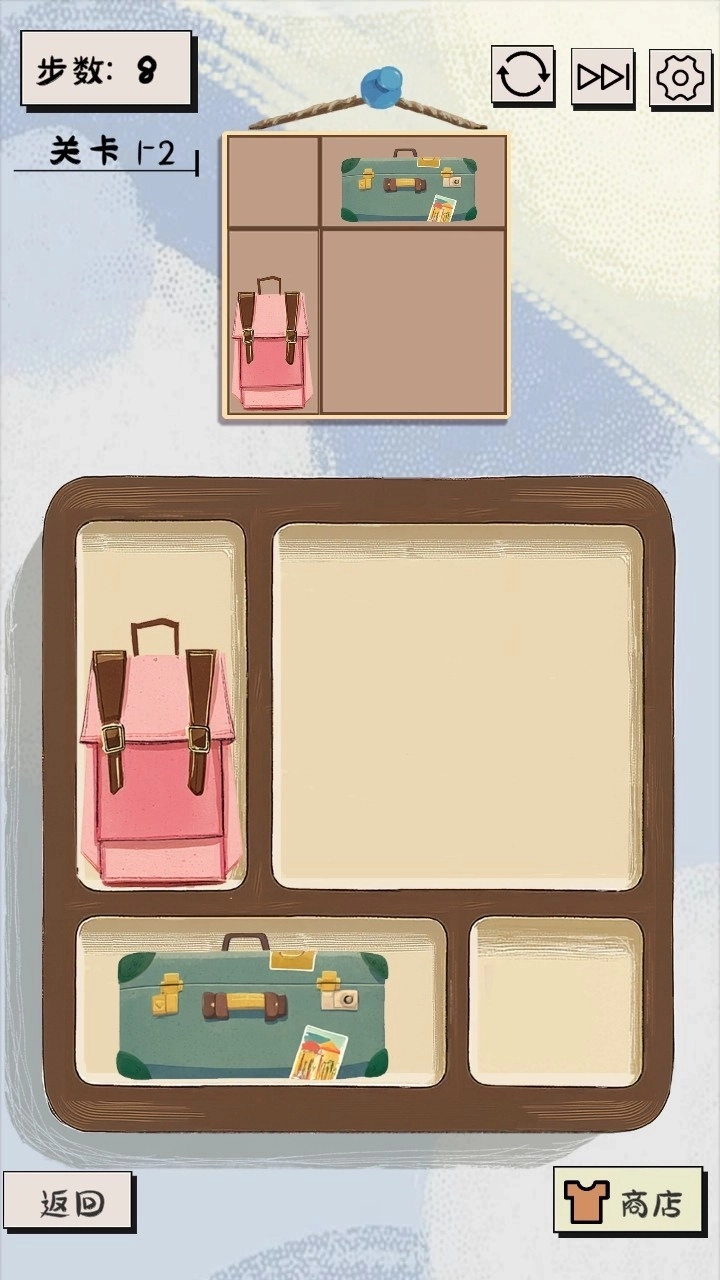 移动方格拼图:关卡中的物品分布在可移动的方格内,玩家自由滑动方格,利用循环机制巧妙调整物品位置。从右侧移出的方格会从左侧出现,合理规划移动路径,逐步让物品归位。