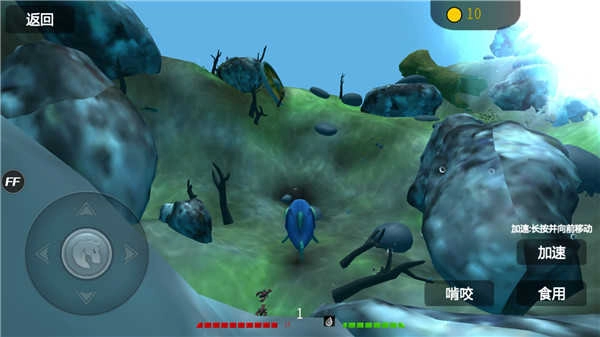 4、你可以寻觅一处地方隐匿蛰伏,静静等待鱼类游过,瞅准时机点击加速,迅猛地冲上去就能将其吃掉。