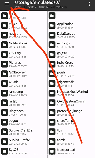 1、在本站好后,来到手机文件夹点击左上角选项;