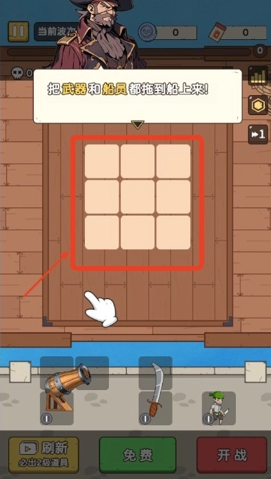 2、在游戏里按照指引,把武器和船员都拖拽到船上对应的格子里。