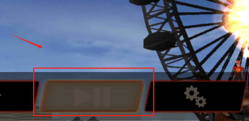 显示屏上呈现着一处游乐场的场景,其中的观览车正燃烧着火焰。画面下方设有三个操作区域,居中的是播放按钮,右侧可进行设置调整,需按照指引望向天空的方向。