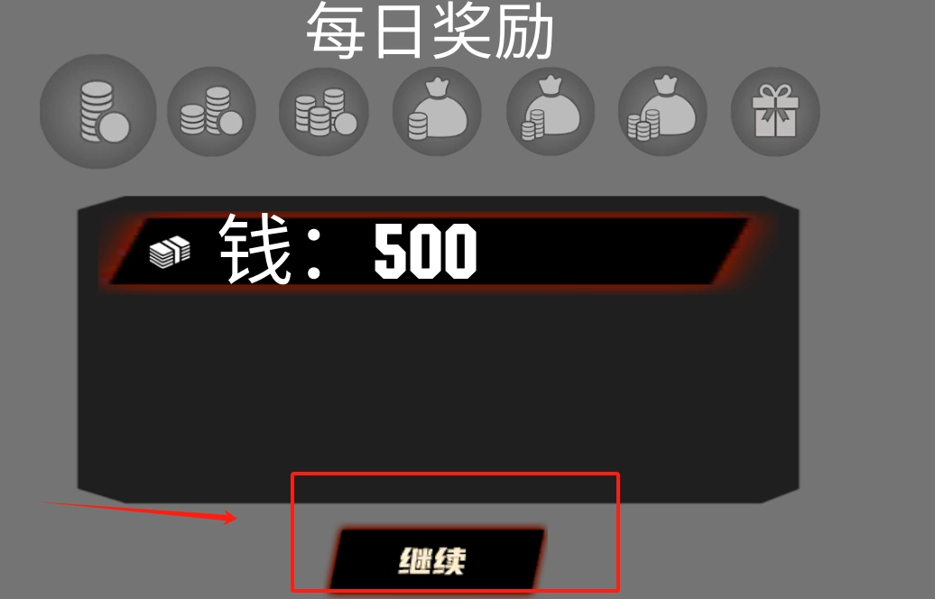 点击“继续”按钮领取500金币奖励,界面上有七个图标,选完之后直接点击那个被红色框标注的按钮就可以了。
