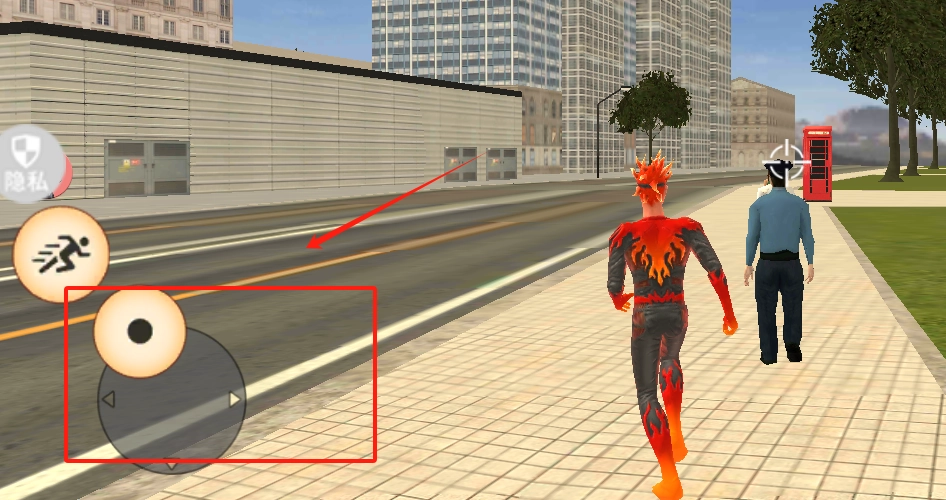 你需要控制那个身着红色衣装、周身环绕火焰特效的角色行进。通过左侧的虚拟摇杆来调整角色的移动方向,当需要加快速度时,点击右下角的箭头按钮即可。行进过程中要仔细观察周边状况,避免让角色撞到路边的树木或者电话亭这类障碍物。