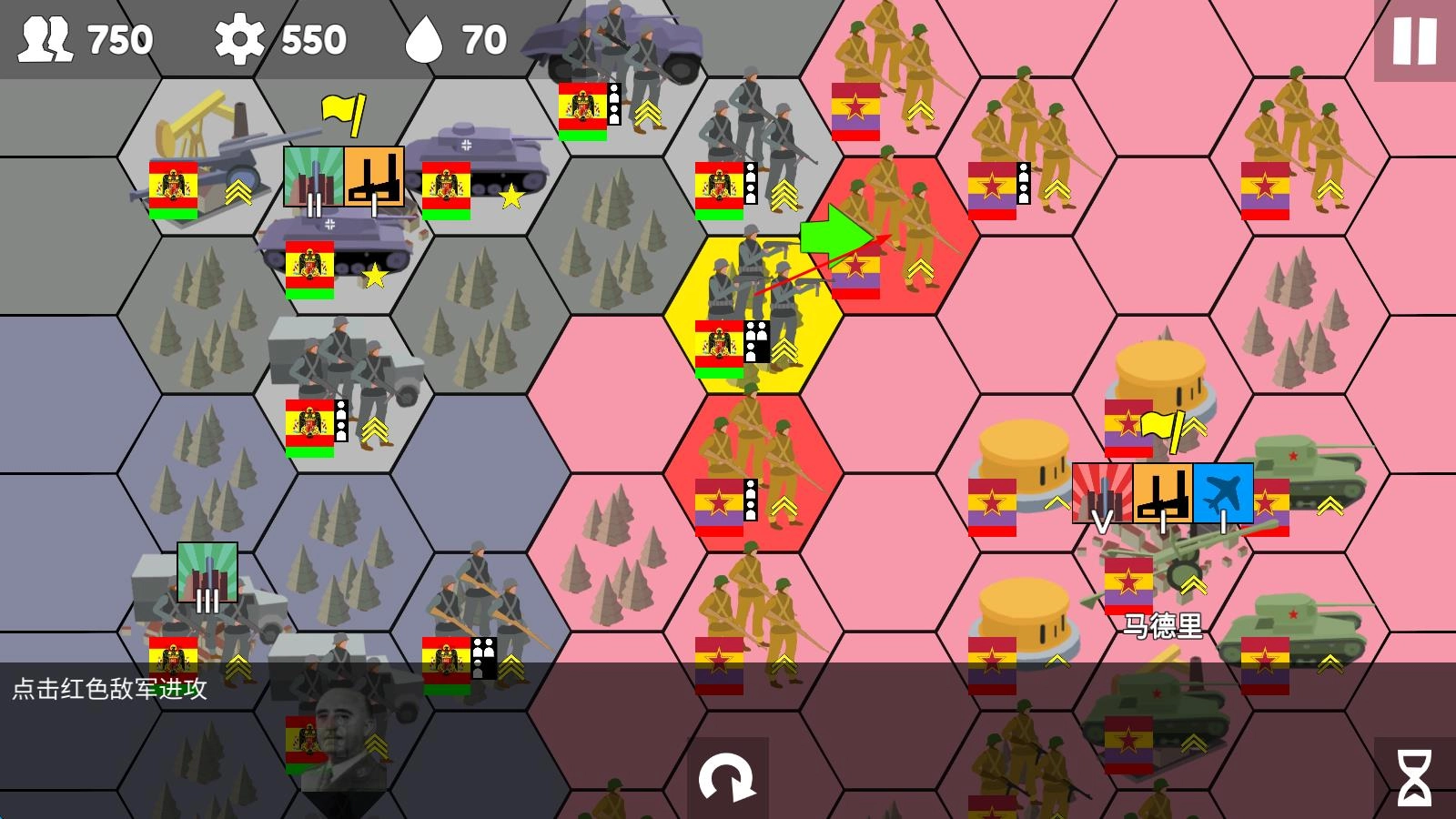 进入游戏后,注意地图上箭头所指的方位,那里就是可以进行操作的目标单位。点击该目标单位,会立刻出现绿色方格,再次点击方格,就能灵活地指挥部队移动,从而开启战略部署的第一步。