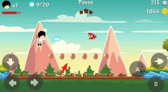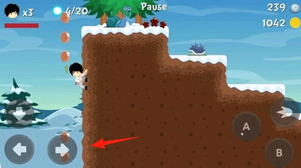 控制那个有着黑色头发的角色(屏幕上用红色箭头标记的那个),在一片白雪皑皑的场景里,通过按动键盘上的左右方向键来移动。你需要让角色爬上那些土黄色的斜坡,同时要小心避开慢悠悠爬着的蜗牛和浑身带刺的刺猬。另外,还要尽可能多地收集散落在各处的金币,目前已经收集了4枚,而总共需要收集20枚,所以还得继续努力收集更多才行。