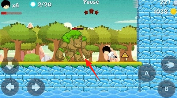 当遭遇树精BOSS(红箭头标记)时,操控角色通过方向键配合跳跃实现灵活走位,避开其攻击的同时抓住反击机会,成功击败BOSS后即可顺利通过森林关卡。