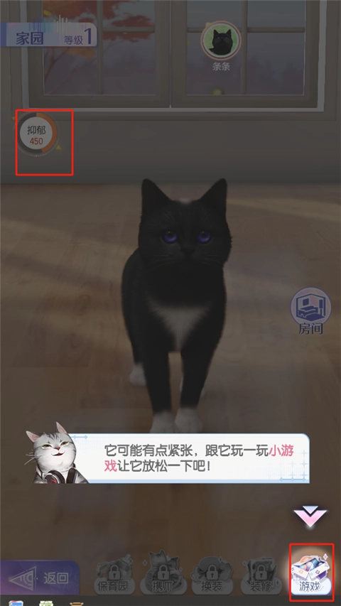 刚搬到新家时猫咪情绪不高,我们可以通过点击游戏来帮它放松心情。