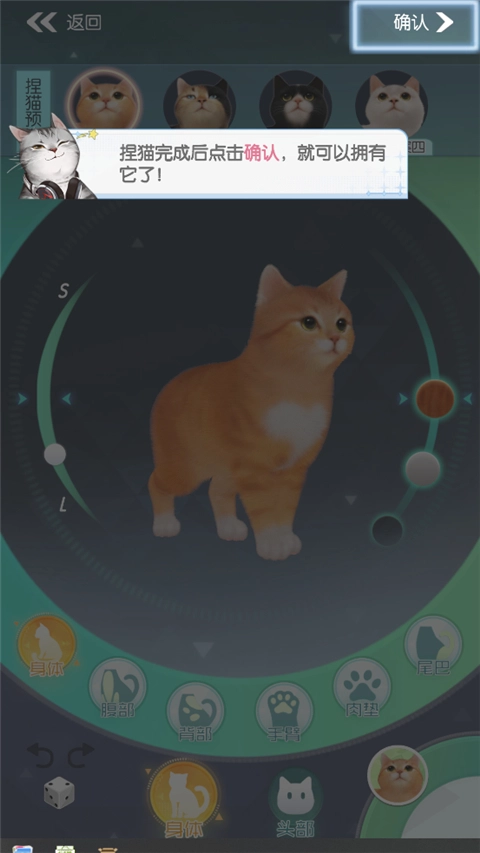 接着进入猫咪面部调整教程,玩家能自行设定猫咪的毛色、躯干、腹部、背部等部位的外观。