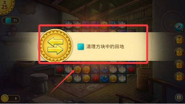 完成第一关的要求很简单,只需把蓝色方块区域里的田地清理干净就行。