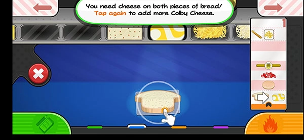 4、选好所需食物后,点击面包片,食物就会自动放置在面包上,最后点击右下方就能制作三明治。