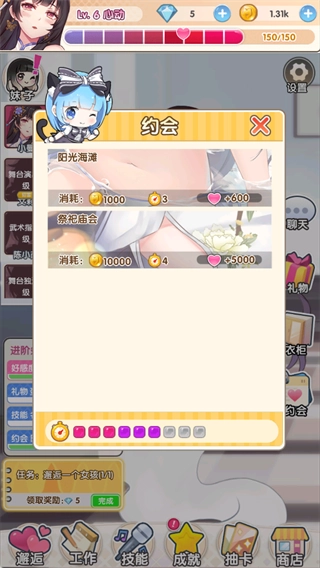 约会场景丰富多样,涵盖阳光海滩、祭祀庙会等。通过消耗金币与时间道具,能大幅提升好感度。