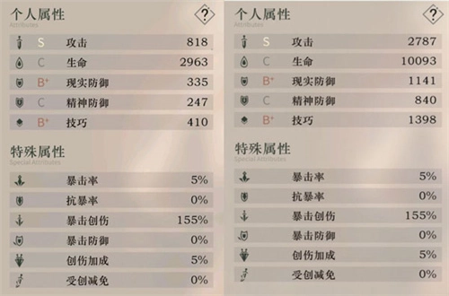 先来比一下个人属性:左侧是狼群1级的面板,右侧是狼群洞悉一30级的面板。