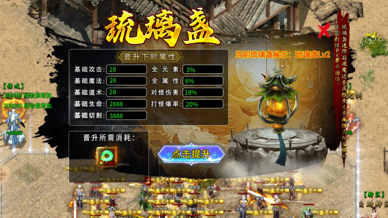 琉璃盏:消耗仙晶即可升级,可获得十分全面的属性加成,同时还能提高打怪的掉落概率。