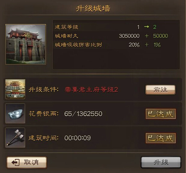 一开始我对“城墙耐久”这个词完全没概念,不过常泡论坛的一个朋友跟我说,只有在被攻击的时候,城墙才会发挥作用——它能帮你分担一部分受到的伤害,升级城墙其实就等于增强了自己这边的生存能力。要是真像他说的这样,那我肯定会优先升级城墙,而且会尽量把城墙等级提得高一些,毕竟比起搞装备,升级城墙明显更划算。