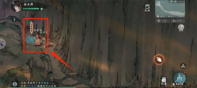 我们在这里找到大黄哥后,往左上方向移动到红框标注的位置,就能跳上屋顶。在屋顶上和大黄哥交谈,会得到一本蓝色的轻功秘籍。接着往前再走一小段路,捡到锦袋,之后看到屋顶上有个靴子形状的图标,点击这个图标就能跳下去了。