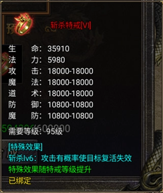 特戒特性:角色死亡时会即刻复活,同时恢复一定比例的生命值与魔法值