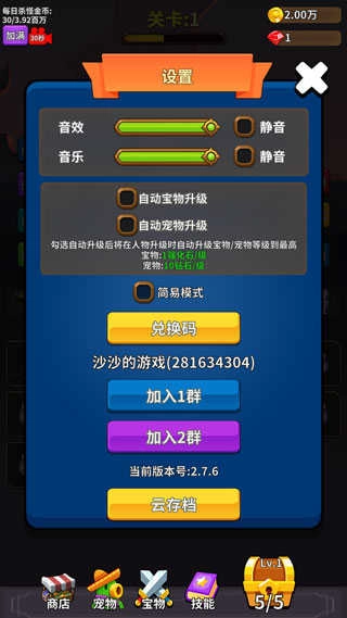 7、此外,点击“设置”,你还能够对自动宝物和宠物升级,以及云存档游戏进行设置。