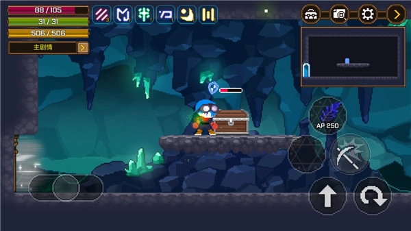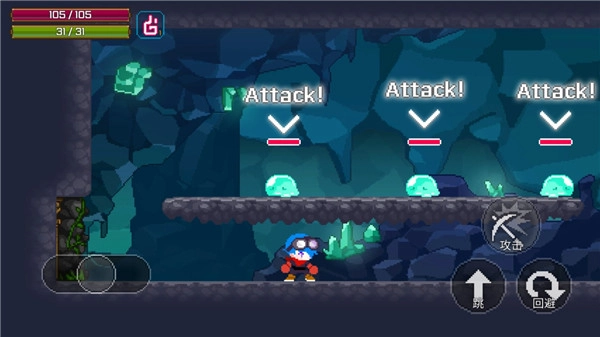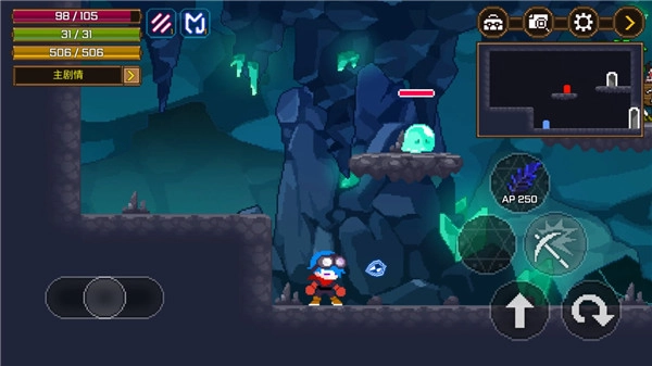 用矿镐近距离攻击怪物,借助走位和技能规避弹幕攻击,消灭敌人能恢复AP。