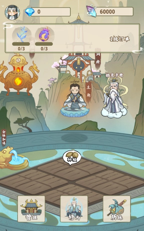 进入游戏后,能看到种植、洞府、炼丹炉、管理等多种玩法。