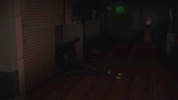 完成剧情动画和选项选择后,圣雅交给我们钥匙,接着就能去打开最右侧的安全门,再往前走几步,就会触发老李发现我们并追赶我们的剧情动画。