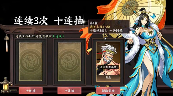 3、还可以去进行抽卡操作,抽到SSR的概率也挺不错的,而且能够直接进行10连抽。