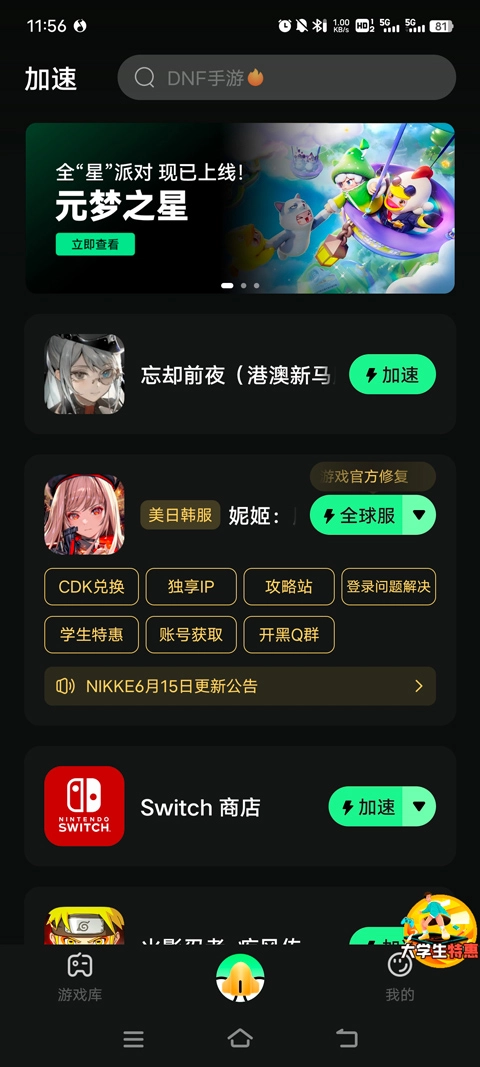 1、第一步,你要在本站网“忘却前夜”这款游戏上进行操作,由于游戏需借助加速器启动,所以先打开奇游加速器,在加速器中找到该游戏,接着点击游戏右侧的加速按钮。