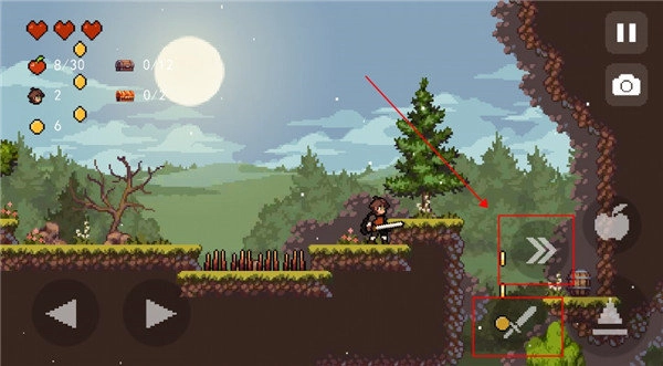 1、左边的两个按键用于左右移动,右边的按键为跳跃键,双击此跳跃键能够实现二段跳,可借助二段跳躲避敌人攻击以及翻越障碍物。