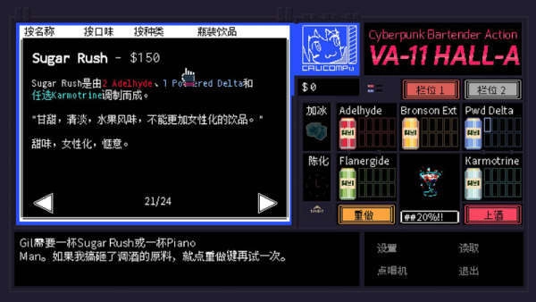 《赛博朋克酒保行动(VA-11 Hall-A)》是一款移植的文字剧情模拟游戏,采用复古经典的像素画面,以赛博朋克风格的反乌托邦世界为背景。在游戏中,玩家将化身为调酒师,为顾客调制各种风味的美酒。