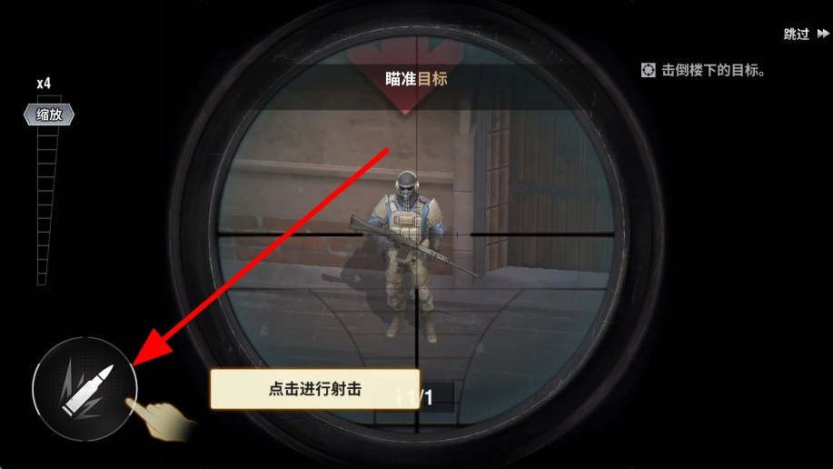2、切换至瞄准镜视角后,认真留意瞄准镜中的目标。待目标处于恰当位置时,点击射击按钮,子弹随即朝目标射出,完成射击操作,精准将目标击倒。
