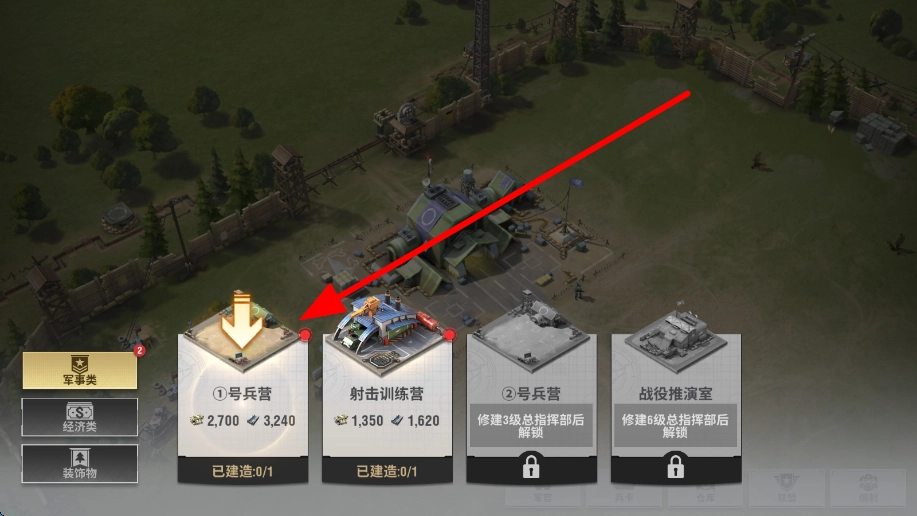 3、在建筑选择界面,选中像1号兵营这样的军事建筑,当满足建造所需的资源等条件时,点击“建造”,该建筑就会被安置到指定的基地位置,助力后续发展。