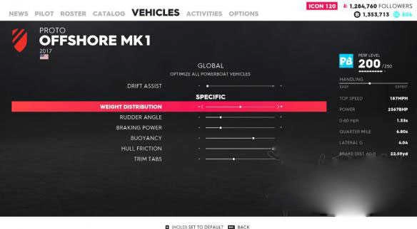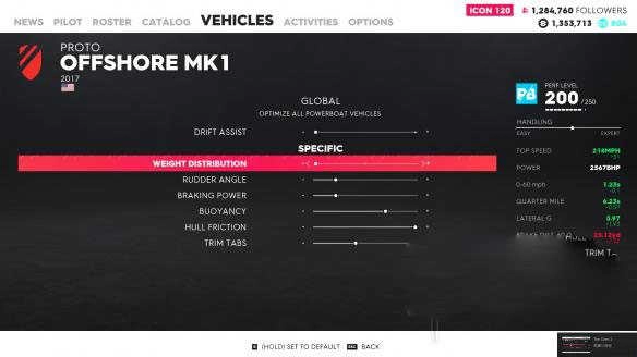 不过并非每艘船都适用相同的调整方式。楼主在游戏中有3艘动力艇(Power Boat),其中另外两艘就并非全往左调效果最佳,不过调整方法也很简单,只需左右调节,找到能使极速达到最高的那一格就行。然而,喷射冲刺船(Jet Sprint)这种船型(也就是那些V8小船)就稍有不同。虽说大体上也是往后调,同样是要找出极速最高的那一格,但在某些跑小河道的赛道上,弯道极为急促,此时将重量分配调至最佳格靠左1 - 2格,能让转向更为灵活。