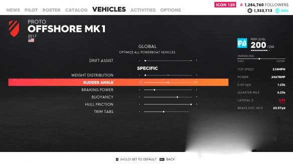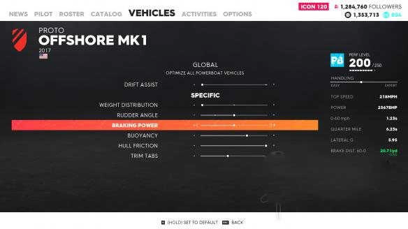 制动力这一项,调节方向是往右调会增加,往左调则降低。但对于船而言,这个制动力基本没什么实际用途。因为船在行驶过程中无论怎样都得按住油门。并且就目前所有的船类赛事来看,其中也包括Jet Sprint,都不存在依靠制动来实现减速的情况。所以,制动力这一项完全可以不用理会。