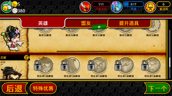 2、11~20阶段:已经有铜钟的话就不用再买了,但弓箭手可以购置。另外,困倦状态出现时要进行升级。
