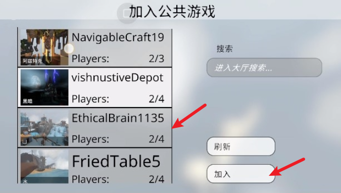 4、成功连接服务器后,我们便能看到各类房间,找到好友的房间名称并加入,之后就可以联机愉快地游戏了。