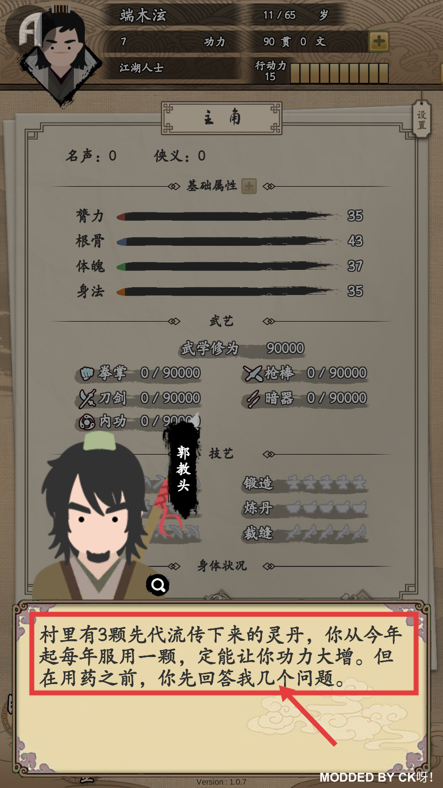 2、根据郭教头的提示,若要服用村里先辈流传下来的灵丹,需先完成他提出的问题,如此方能助力功力大幅提升。