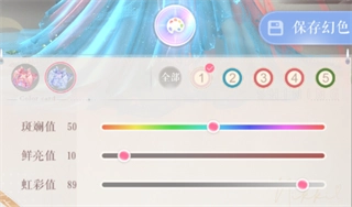 点击色盘按钮,就能在【新色盘模式】与【自定义色盘模式】之间切换;自定义色盘提供斑斓值、鲜亮值和虹彩值三个调节维度,拖动各维度对应的滑杆,就能自由调整颜色,开展更丰富的幻色创作。