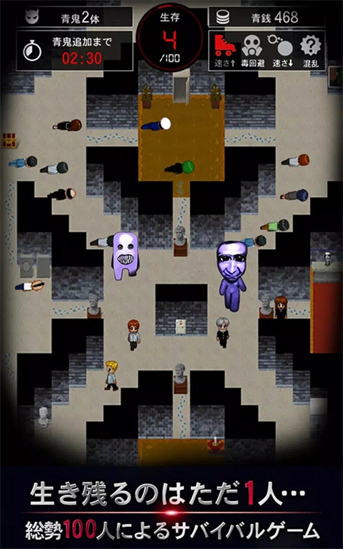 100名参与者与青鬼在线生成(这100名里包含NPC),玩家操控这100人里的其中一个,躲避青鬼的追踪,坚持到最后即为获胜。