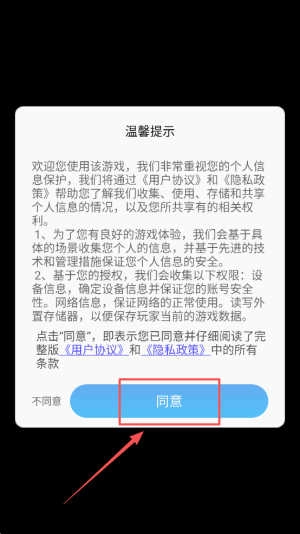 首先,请仔细阅读游戏的隐私政策与用户协议,若确认同意相关条款,可点击“同意”按钮来推进后续流程。
