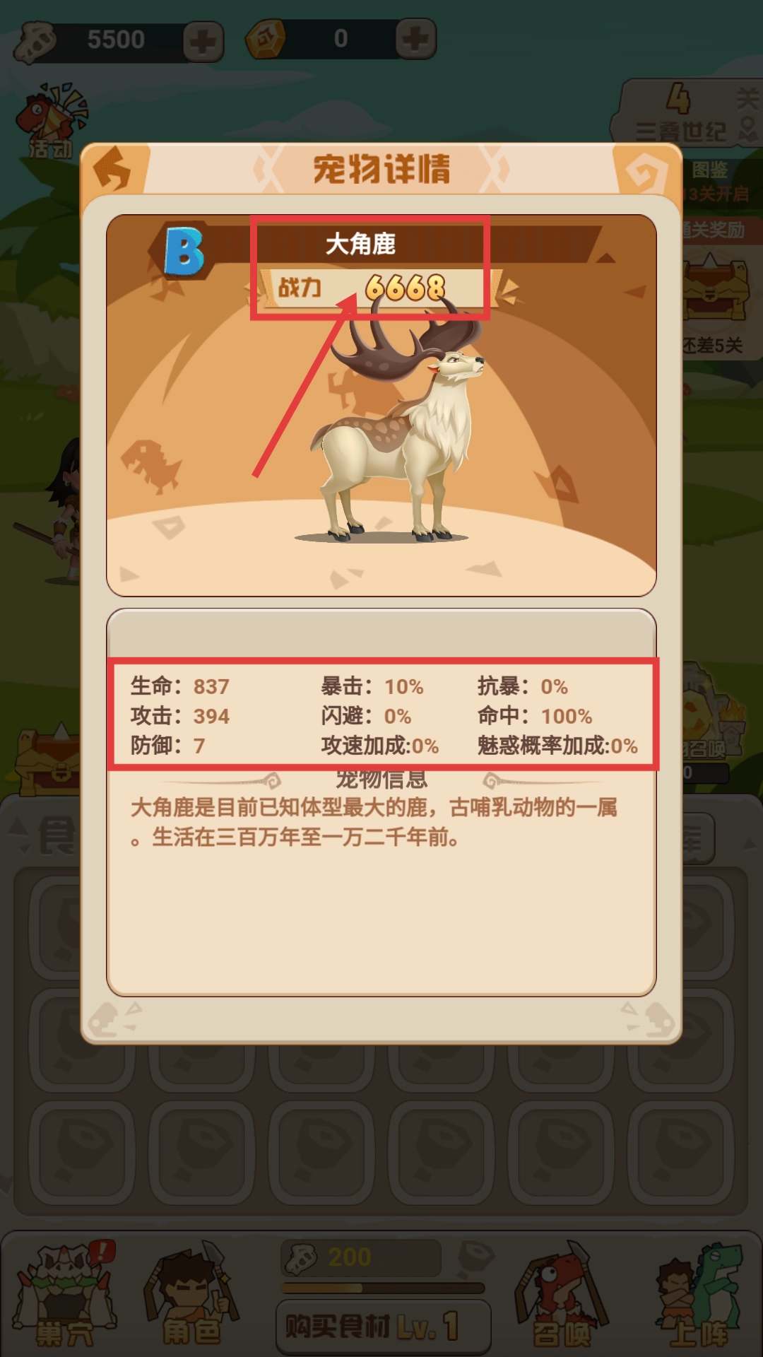 查看【大角鹿-战力6668】的宠物详情,了解其生命-837、攻击-394等属性,为宠物培养做规划。
