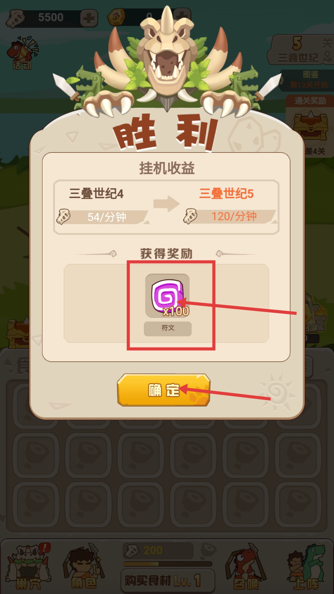 战斗胜利后,你将获得【符文-x100】的奖励,点击【确定】按钮即可领取。领取后不仅能提升挂机收益,还能解锁三叠世纪5关卡。