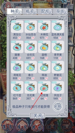 在游戏里先选【集市】,购买红玫瑰和白玫瑰的种子,要是商店里没货,就得刷新获取。